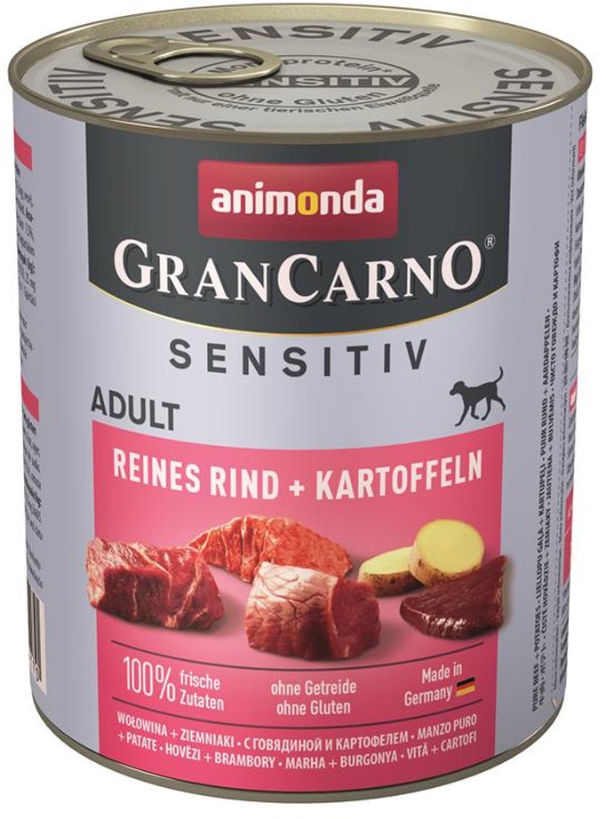 Animonda Dog GranCarno Adult Sensitiv Reines Rind & Kartoffeln - enthält 53 % Rind. Ohne künstliche Farb- und Konservierungsstoffe und Getreide, sowie ohne Gluten, Soja und Zucker. Eine natürliche Quelle für Calcium, Natrium und Chlorid. Alleinfuttermittel für ausgewachsene, ernährungssensible Hunde von 1 - 6 Jahren.