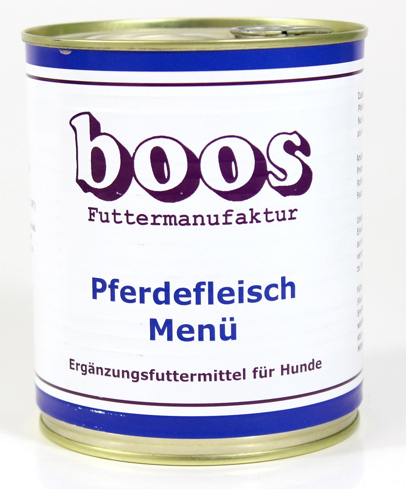 Boos Pferdefleisch Menü - Enthält 70% Pferdefleisch und Kartoffeln. Besteht ausschließlich aus reinem, gekochten Fleisch. Ohne Eiweißextrakte, Konservierungsmittel, Farb- und Aromastoffe jeglicher Art. Die verwendeten Produkte stammen von frisch geschlachteten Tieren. Es werden keine tierischen und pflanzlichen Nebenprodukte verwendet. Ergänzungsfuttermittel für Hunde.