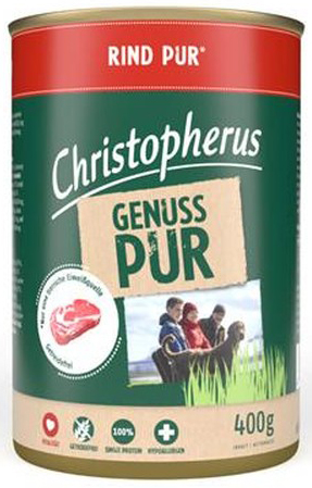 Christopherus Rind PUR - mit 70% Fleisch und Innereien vom Rind. Durch das Singleprotein hervorragend bei Futtermittelallergien oder Nahrungsunverträglichkeiten geeignet. Hergestellt ohne Getreide, pflanzliche Eiweißextrakte (Soja) sowie Farb-, Aroma- und Konservierungsstoffe. Alleinfuttermittel für erwachsene Hunde mit Futtermittelallergien.