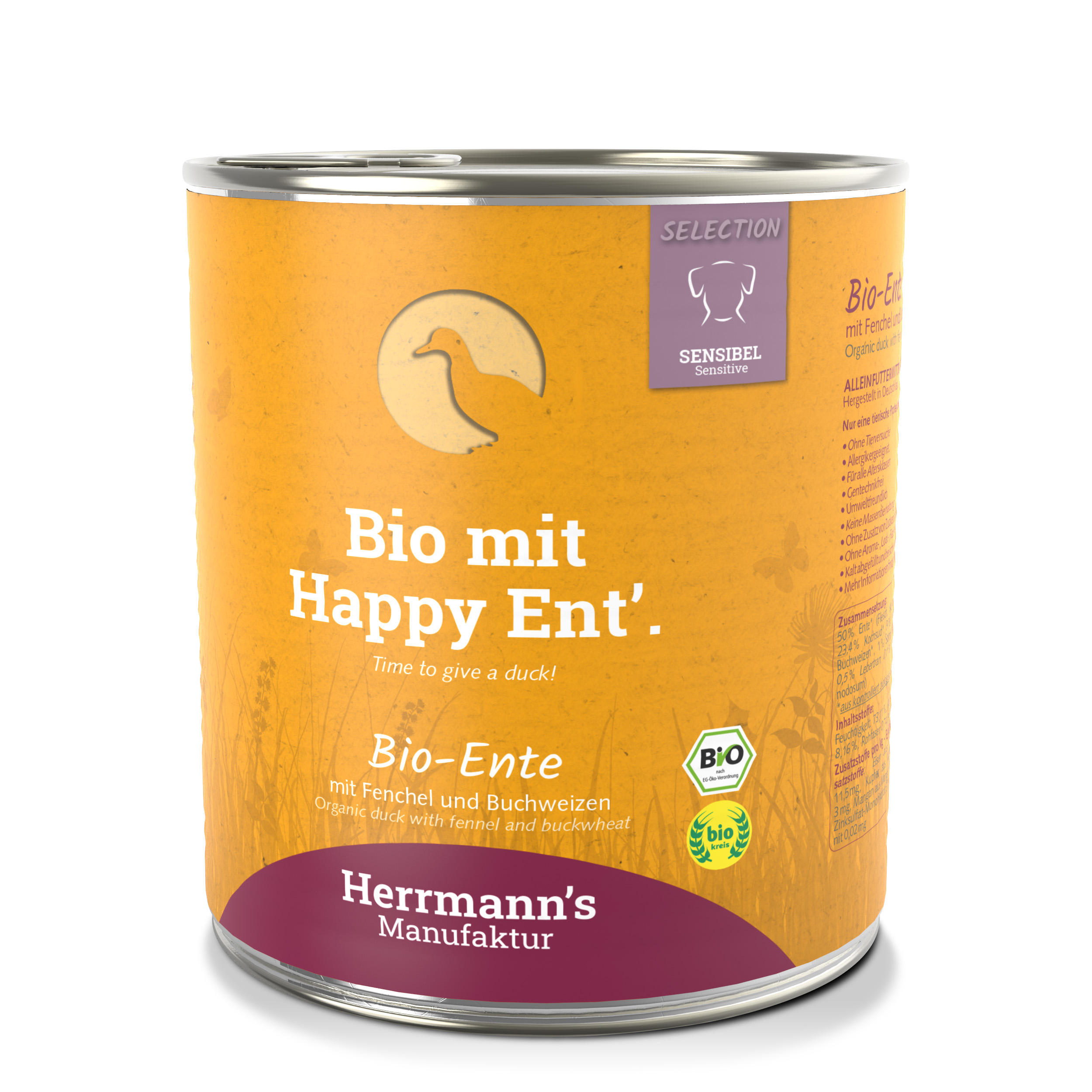 Herrmanns Selection Sensible Bio Ente, Fenchel und Buchweizen - enthält 50% Ente aus Fleisch, Karkasse, Herz, Hals, Leber. Ergänzt mit Bierhefe (für B-Vitamine), Sonnenblumenöl (für Vitamin E), Lebertran (für Vitamin A und D) und Knotentang (für Jod). Mit Zutaten aus kontrolliert biologischer Erzeugung, sowie artgerechter Tierhaltung. Keine Massentierhaltung, keine Tierversuche. Hergestellt in Deutschland ohne Zusatz von Zucker und Geschmacksverstärkern, sowie ohne Aroma-, Lock-, Farb- und Konservierungsstoffe. Gentechnikfrei. Alleinfuttermittel für Hunde, Allergikergeeignet, da getreidefrei, glutenfrei, laktosefrei.