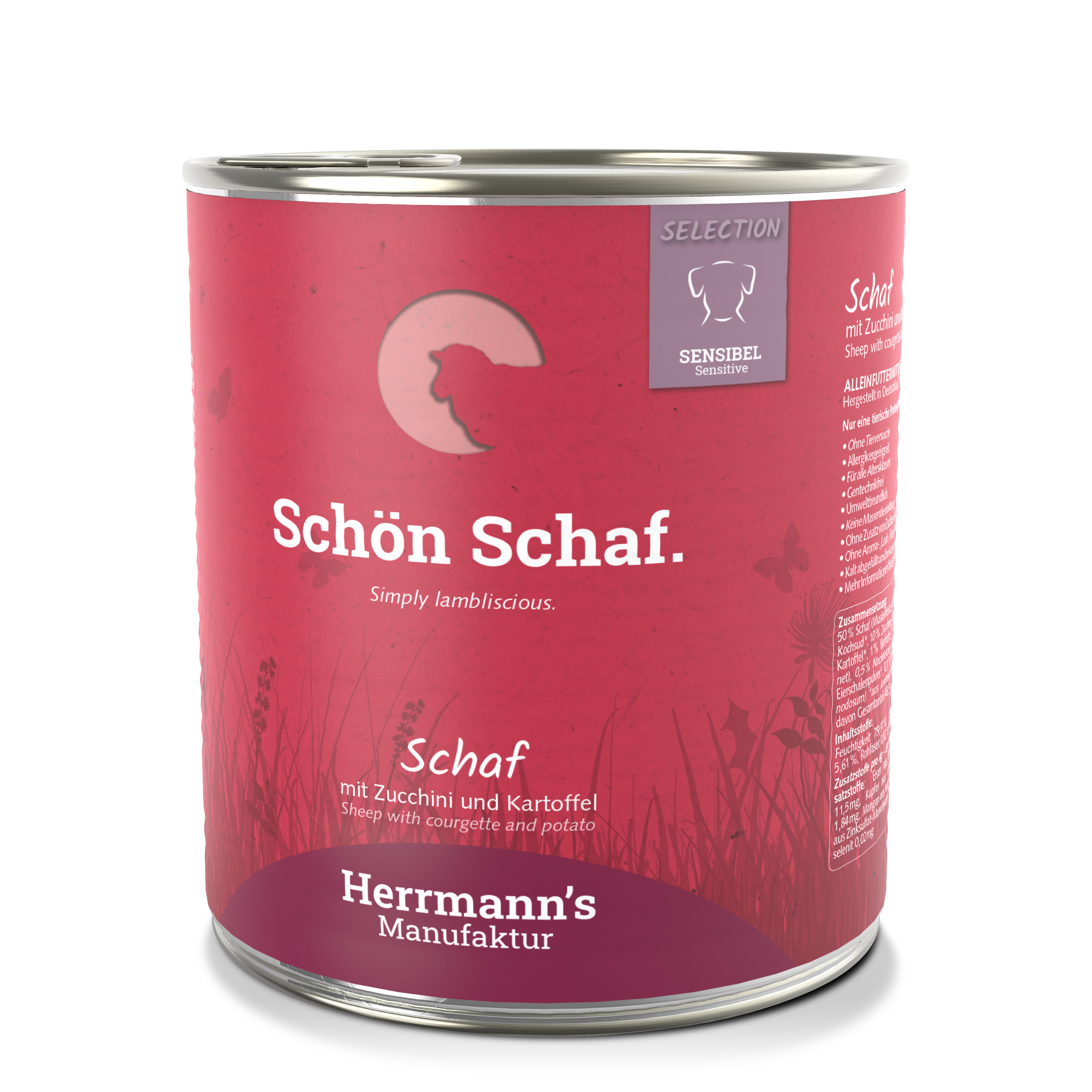 Herrmanns Selection Sensible Schaf, Zucchini und Kartoffeln - enthält 50% Schaf aus Muskelfleisch, Lunge, Herz, Leber. Ergänzt mit Bierhefe (für B-Vitamine), Nachtkerzenöl (für Omega-6-Fettsäuren), Algenkalk (für Calcium), Lebertran (für Vitamin A und D) und Knotentang (für Jod). Mit Zutaten aus kontrolliert biologischer Erzeugung, sowie artgerechter Tierhaltung. Keine Massentierhaltung, keine Tierversuche. Hergestellt in Deutschland ohne Zusatz von Zucker und Geschmacksverstärkern, sowie ohne Aroma-, Lock-, Farb- und Konservierungsstoffe. Gentechnikfrei. Alleinfuttermittel für Hunde, Allergikergeeignet, da getreidefrei, glutenfrei, laktosefrei.