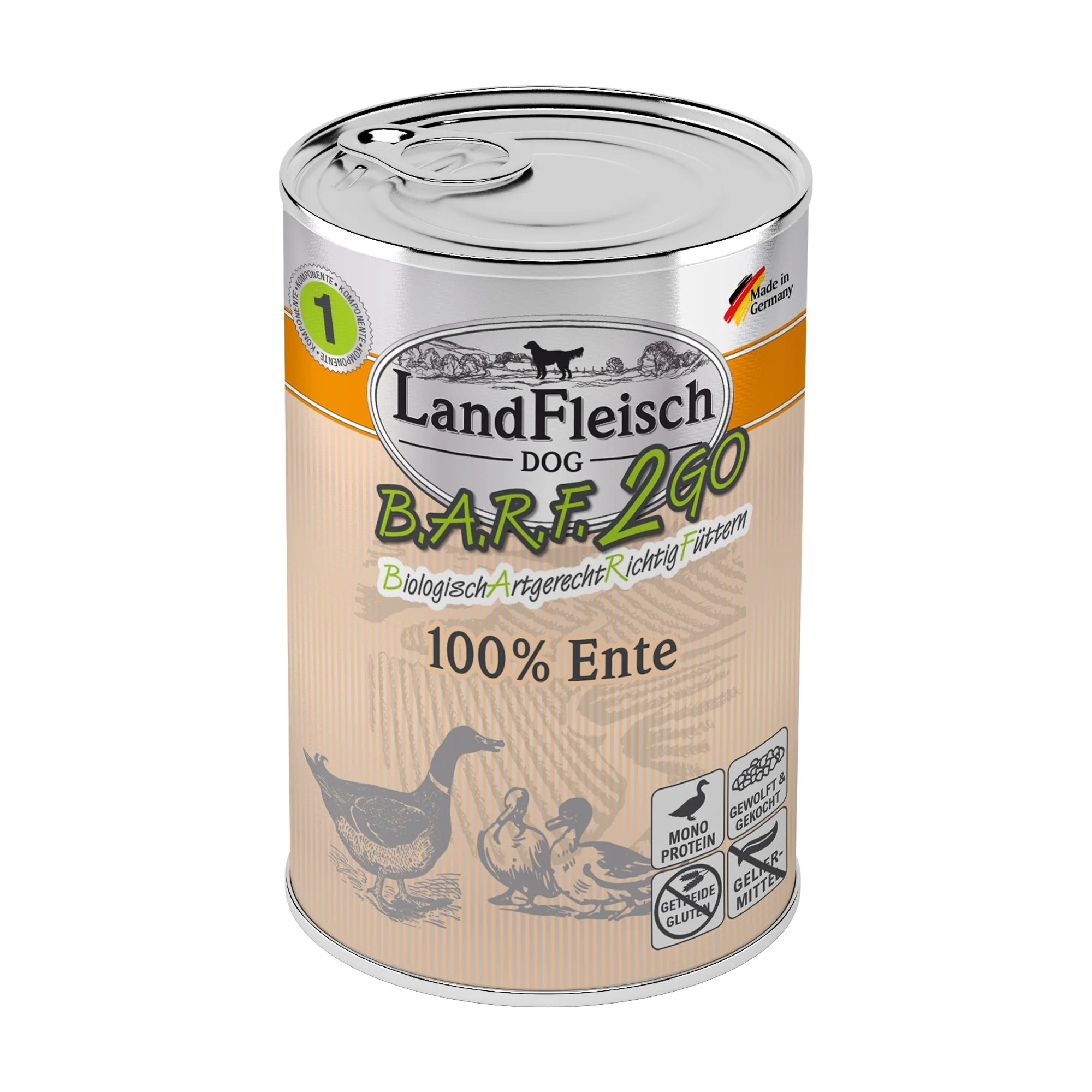 LandFleisch Dog BARF2GO 100% von der Ente - mit 100% Ente, bestehend aus Fleisch, Herzen, Leber, Mägen, Karkassen. Enthält ausschließlich Fleisch von lebensmittelkontrollierten Schlachttieren. Hergestellt ohne Getreide, Sojaprodukte und GVO, sowie ohne künstliche Vitamine oder Geliermittel. Enthält keine künstlichen Farb- und Konservierungsstoffe. Ergänzungsfuttermittel für ausgewachsene, ernährungssensible Hunde.