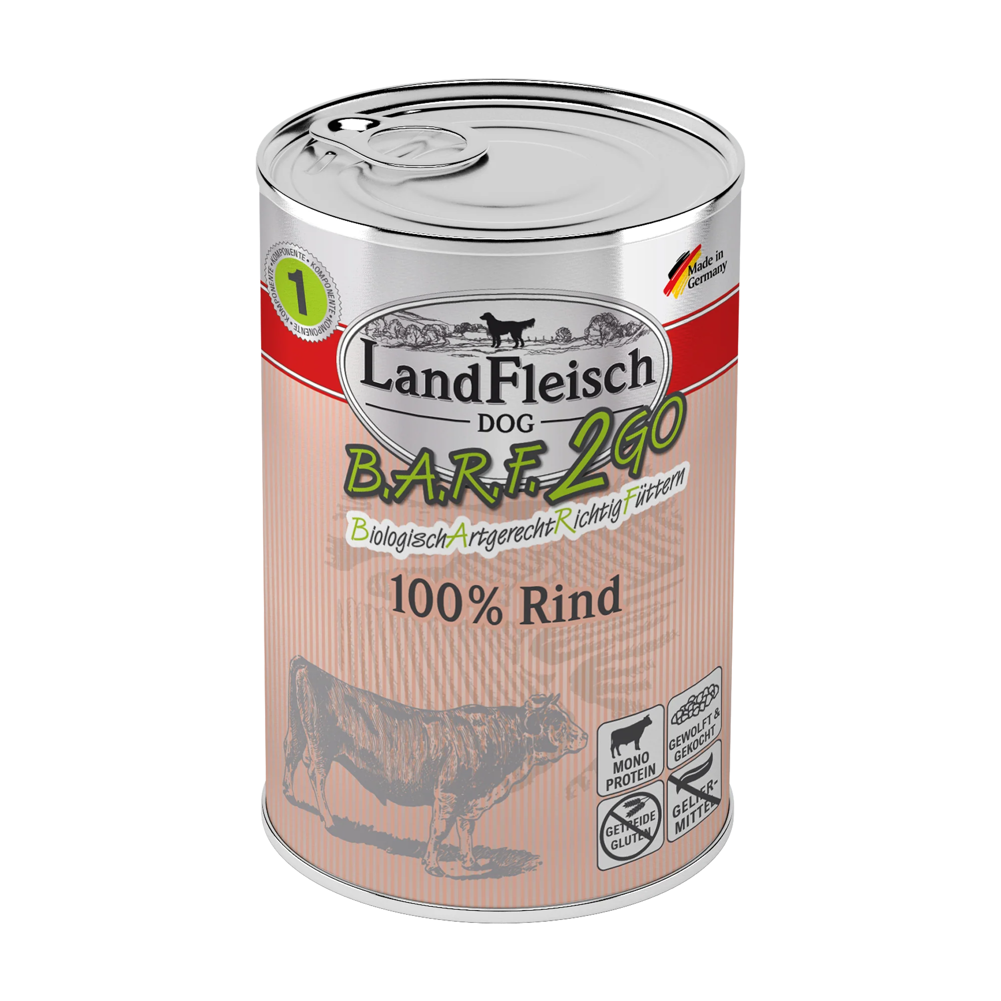 LandFleisch Dog BARF2GO 100% vom Rind - mit 100% Rind, bestehend aus Fleisch, Lungen, Leber, Herzen, Pansen, Leber. Enthält ausschließlich Fleisch von lebensmittelkontrollierten Schlachttieren. Hergestellt ohne Getreide, Gemüse, Sojaprodukte und GVO, sowie ohne künstliche Vitamine oder Geliermittel. Enthält keine künstlichen Farb- und Konservierungsstoffe. Ergänzungsfuttermittel für ausgewachsene, ernährungssensible Hunde.