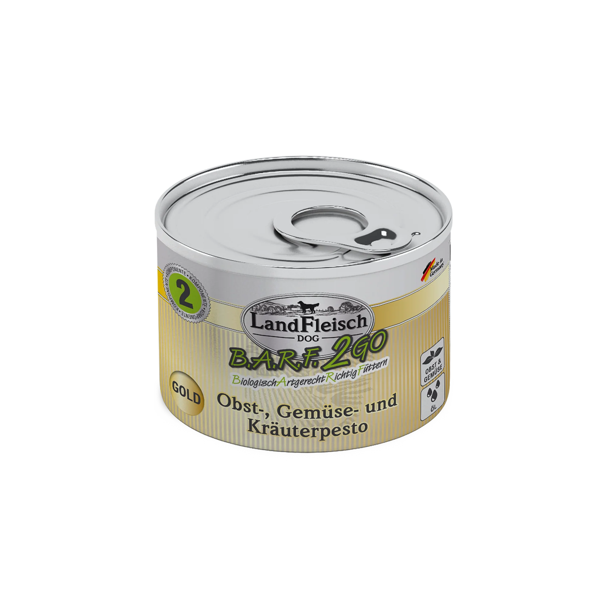 LandFleisch B.A.R.F.2GO Obst-, Gemüse- und Kräuterpesto GOLD besteht aus einer natürlichen Vielfalt an vitaminreichem Obst und Gemüse sowie mineralreichen Kräutern und hochwertigen Ölen. Diese Zutaten sind fein zerkleinert und dadurch besonders bioverfügbar. Sie entsprechen hervorragend den natürlichen Futtergewohnheiten des „Urhundes“. Ausgetretener Obst- und Gemüsesaft sowie Oxidationen am Dosenboden sind Zeichen der Naturbelassenheit des Produkts.