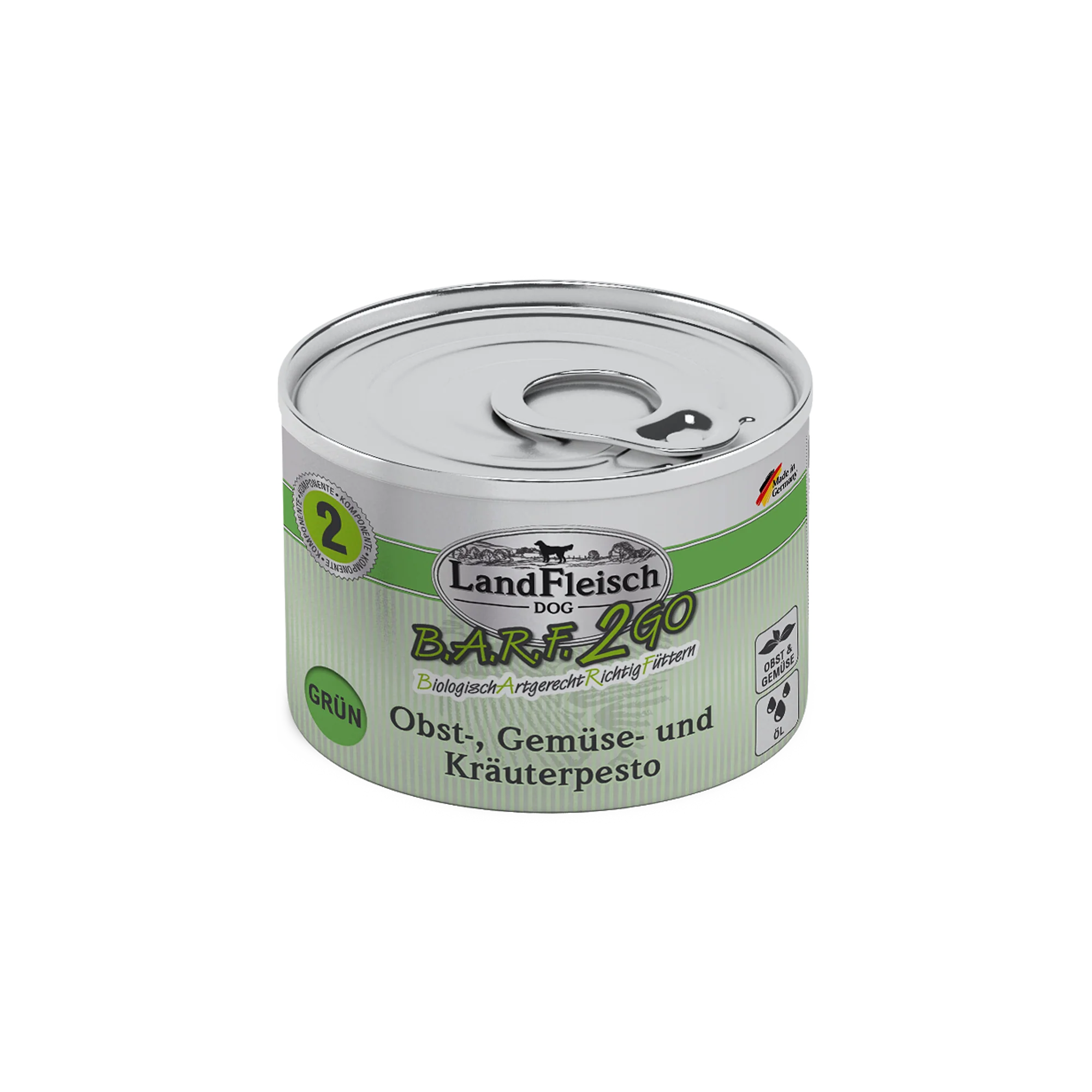 LandFleisch B.A.R.F.2GO Obst-, Gemüse- und Kräuterpesto GRÜN besteht aus einer natürlichen Vielfalt an vitaminreichem Obst und Gemüse sowie mineralreichen Kräutern und hochwertigen Ölen. Diese Zutaten sind fein zerkleinert und dadurch besonders bioverfügbar. Sie entsprechen hervorragend den natürlichen Futtergewohnheiten des „Urhundes“. Ausgetretener Obst- und Gemüsesaft sowie Oxidationen am Dosenboden sind Zeichen der Naturbelassenheit des Produkts.