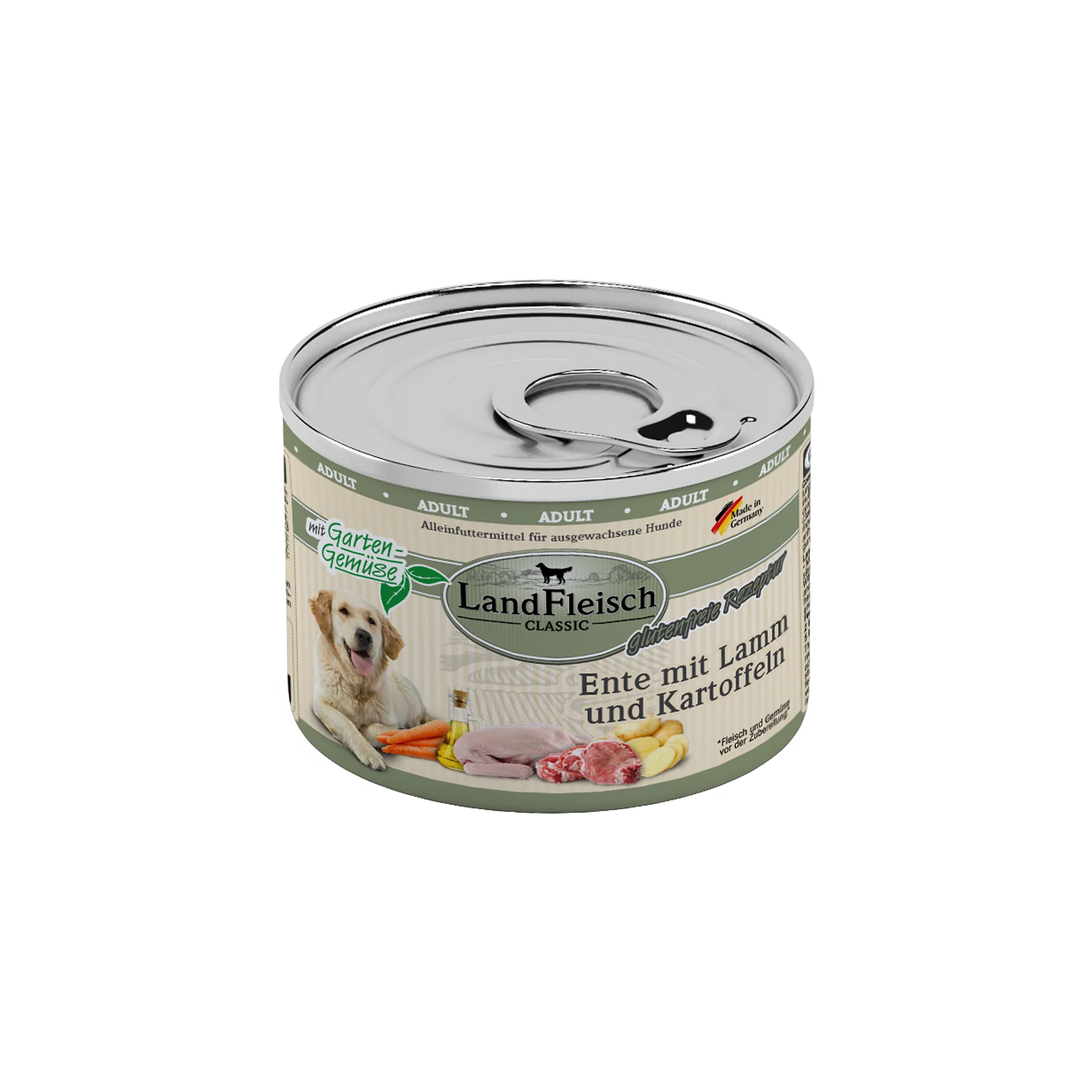 LandFleisch Dog Classic Ente, Lamm und Kartoffeln - frei von Gluten und mit 26 % Ente und 20 % Lamm. Enthält ausschließlich Fleisch von lebensmittelkontrollierten Schlachttieren und frisches Gemüse. Ist angereichert mit wertvollem Rapsöl und liefert auf diese Weise essenzielle Omega-3- und Omega-6-Fettsäuren für ein glänzendes Fell und eine gesunde Haut. Ohne Zusatz von Zucker, Gluten, GVO und Soja. Inulin unterstützt die Darmflora und fördert die Verdauung. Enthält keine künstlichen Geschmacks-, Farb- und Konservierungsstoffe. Alleinfuttermittel für ausgewachsene Hunde.