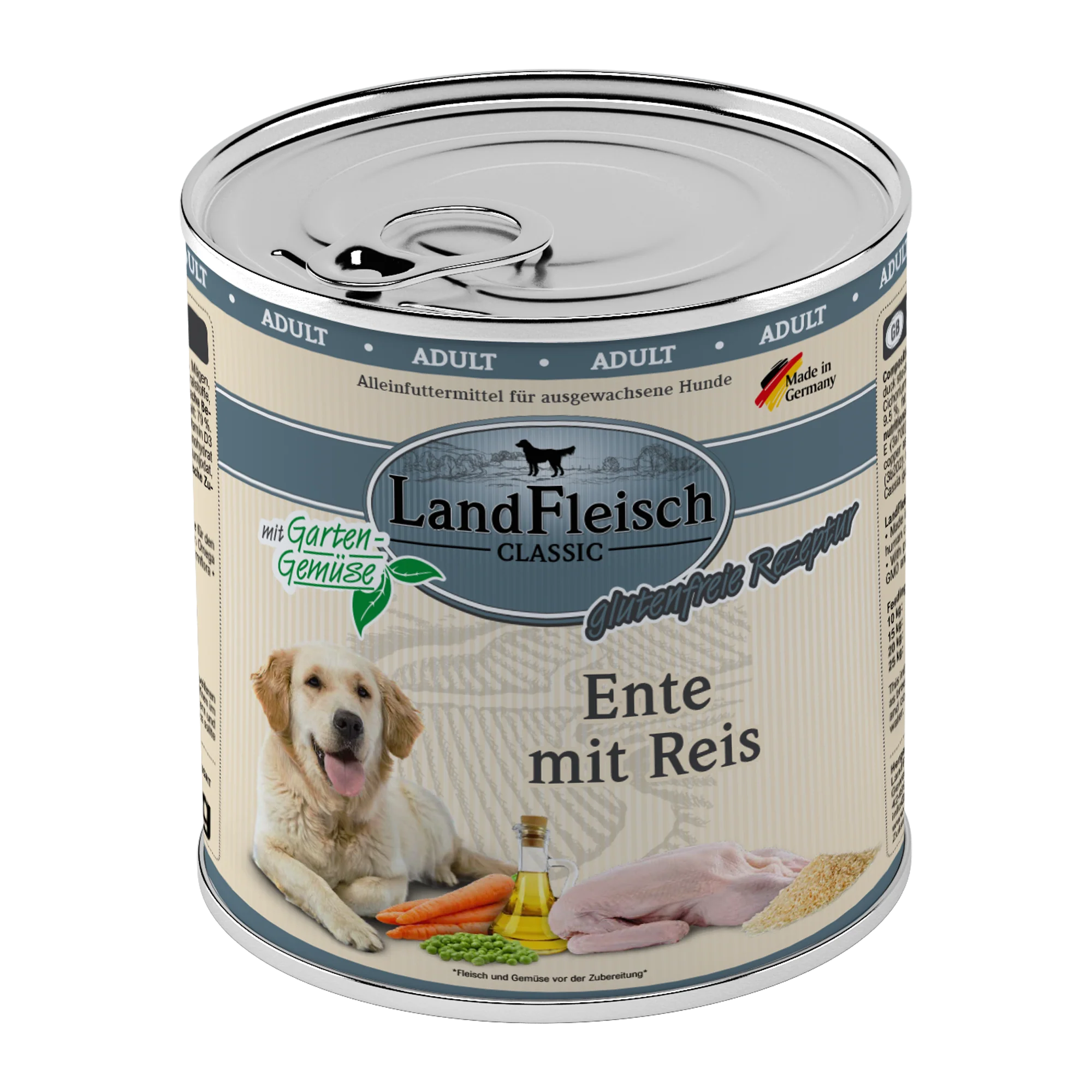 LandFleisch Dog Classic Ente mit Reis - frei von Gluten und mit 40 % Ente und 5 % Reis. Enthält ausschließlich Fleisch von lebensmittelkontrollierten Schlachttieren und frisches Gemüse. Ist angereichert mit wertvollem Rapsöl und liefert auf diese Weise essenzielle Omega-3- und Omega-6-Fettsäuren für ein glänzendes Fell und eine gesunde Haut. Ohne Zusatz von Zucker, Gluten, GVO und Soja. Inulin unterstützt die Darmflora und fördert die Verdauung. Enthält keine künstlichen Geschmacks-, Farb- und Konservierungsstoffe. Alleinfuttermittel für ausgewachsene Hunde.