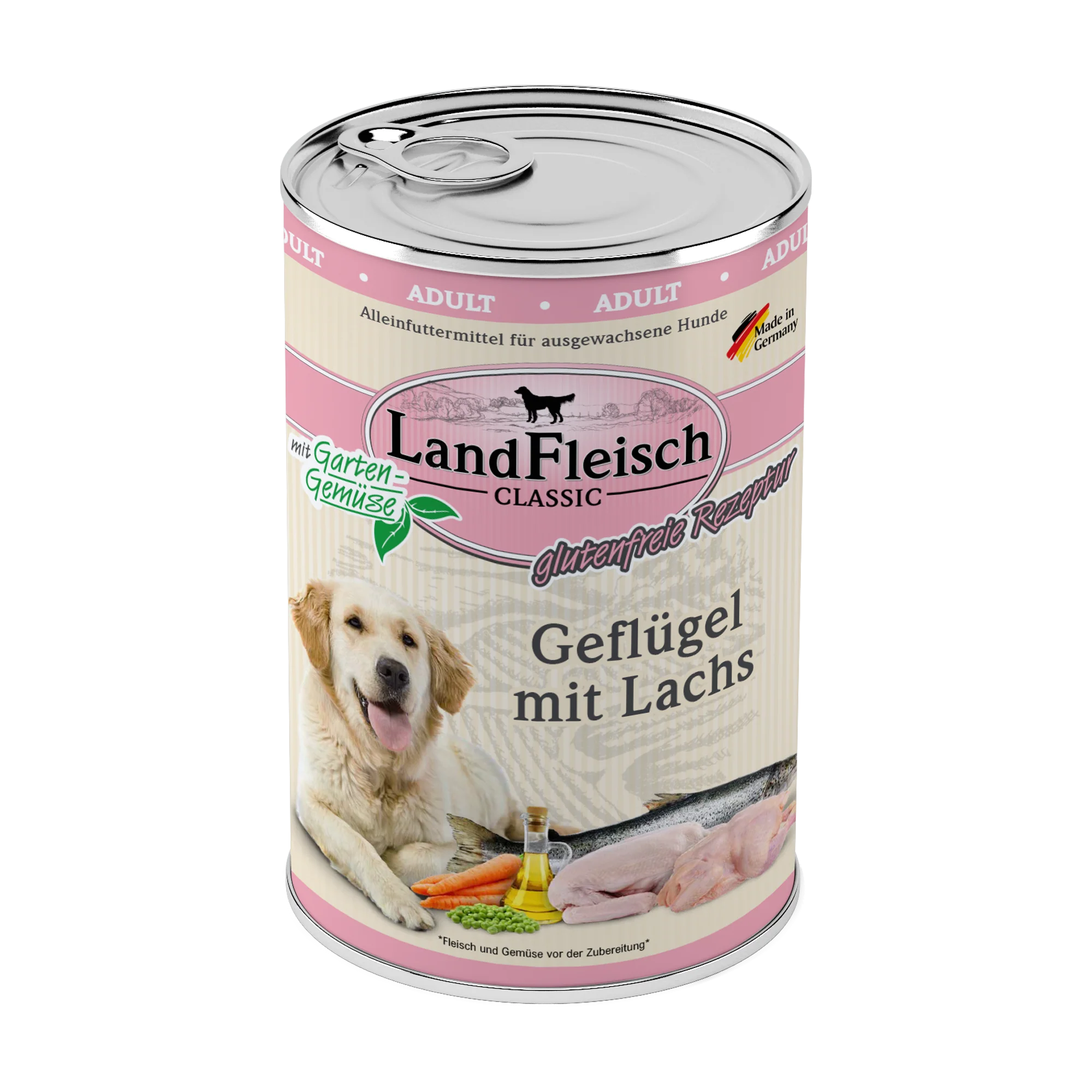 LandFleisch Dog Classic Geflügel mit Lachs - frei von Gluten und mit 30 % Ente und 25 % Lachs. Enthält ausschließlich Fleisch von lebensmittelkontrollierten Schlachttieren und frisches Gemüse. Ist angereichert mit wertvollem Rapsöl und liefert auf diese Weise essenzielle Omega-3- und Omega-6-Fettsäuren für ein glänzendes Fell und eine gesunde Haut. Ohne Zusatz von Zucker, Gluten, GVO und Soja. Inulin unterstützt die Darmflora und fördert die Verdauung. Enthält keine künstlichen Geschmacks-, Farb- und Konservierungsstoffe. Alleinfuttermittel für ausgewachsene Hunde.