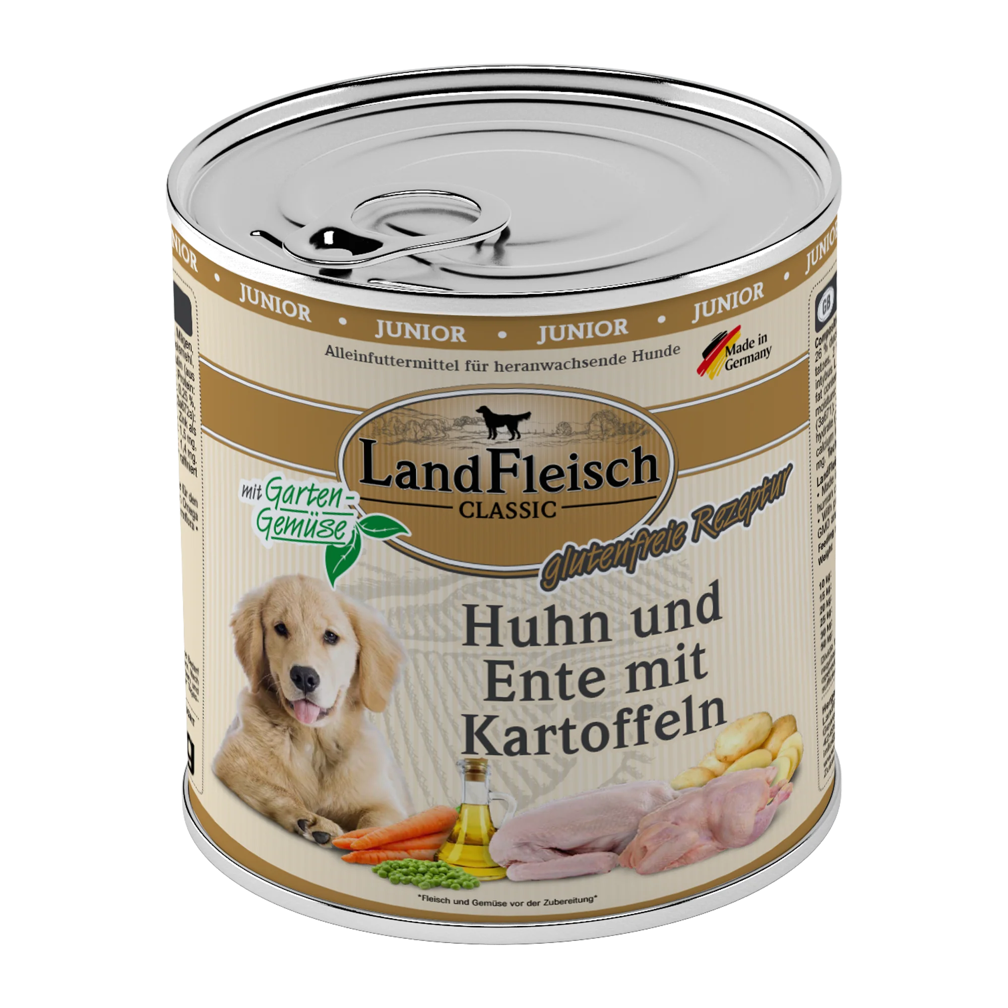 LandFleisch Dog Classic Junior Huhn, Ente und Kartoffeln - frei von Gluten und mit 26 % Huhn und 26 % Ente. Enthält ausschließlich Fleisch von lebensmittelkontrollierten Schlachttieren und frisches Gemüse. Ist angereichert mit wertvollem Rapsöl und liefert auf diese Weise essenzielle Omega-3- und Omega-6-Fettsäuren für ein glänzendes Fell und eine gesunde Haut. Ohne Zusatz von Zucker, Gluten, GVO und Soja. Inulin unterstützt die Darmflora und fördert die Verdauung. Enthält keine künstlichen Geschmacks-, Farb- und Konservierungsstoffe. Alleinfuttermittel für heranwachsende Hunde.