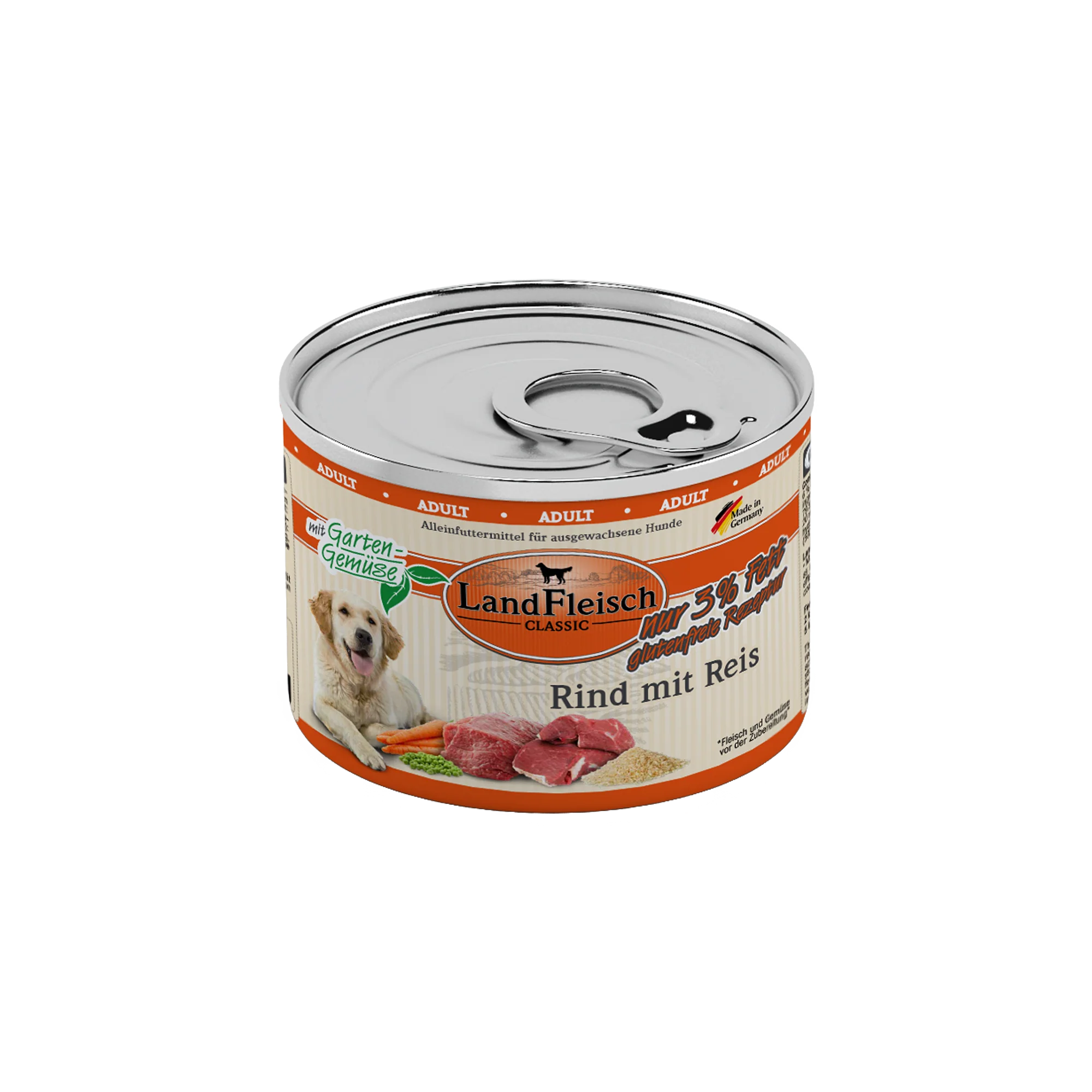 LandFleisch Dog Classic Rind mit Reis - frei von Gluten und mit 20 % Rind und 6 % Reis. Enthält ausschließlich Fleisch von lebensmittelkontrollierten Schlachttieren und frisches Gemüse. Ist angereichert mit wertvollem Rapsöl und liefert auf diese Weise essenzielle Omega-3- und Omega-6-Fettsäuren für ein glänzendes Fell und eine gesunde Haut. Ohne Zusatz von Zucker, Gluten, GVO und Soja. Inulin unterstützt die Darmflora und fördert die Verdauung. Enthält keine künstlichen Geschmacks-, Farb- und Konservierungsstoffe. Alleinfuttermittel für ausgewachsene Hunde.