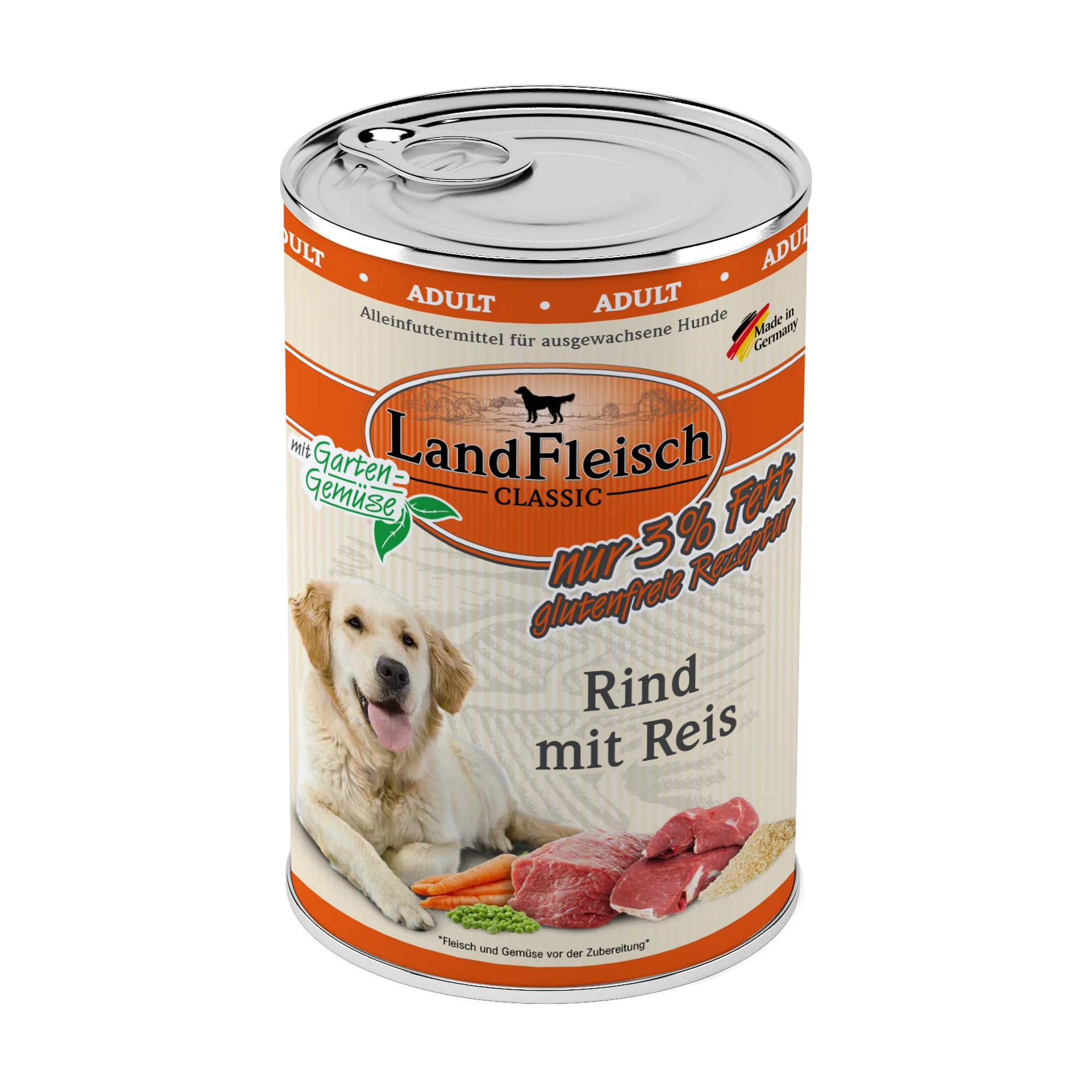LandFleisch Dog Classic Rind mit Reis - frei von Gluten und mit 20 % Rind und 6 % Reis. Enthält ausschließlich Fleisch von lebensmittelkontrollierten Schlachttieren und frisches Gemüse. Ist angereichert mit wertvollem Rapsöl und liefert auf diese Weise essenzielle Omega-3- und Omega-6-Fettsäuren für ein glänzendes Fell und eine gesunde Haut. Ohne Zusatz von Zucker, Gluten, GVO und Soja. Inulin unterstützt die Darmflora und fördert die Verdauung. Enthält keine künstlichen Geschmacks-, Farb- und Konservierungsstoffe. Alleinfuttermittel für ausgewachsene Hunde.