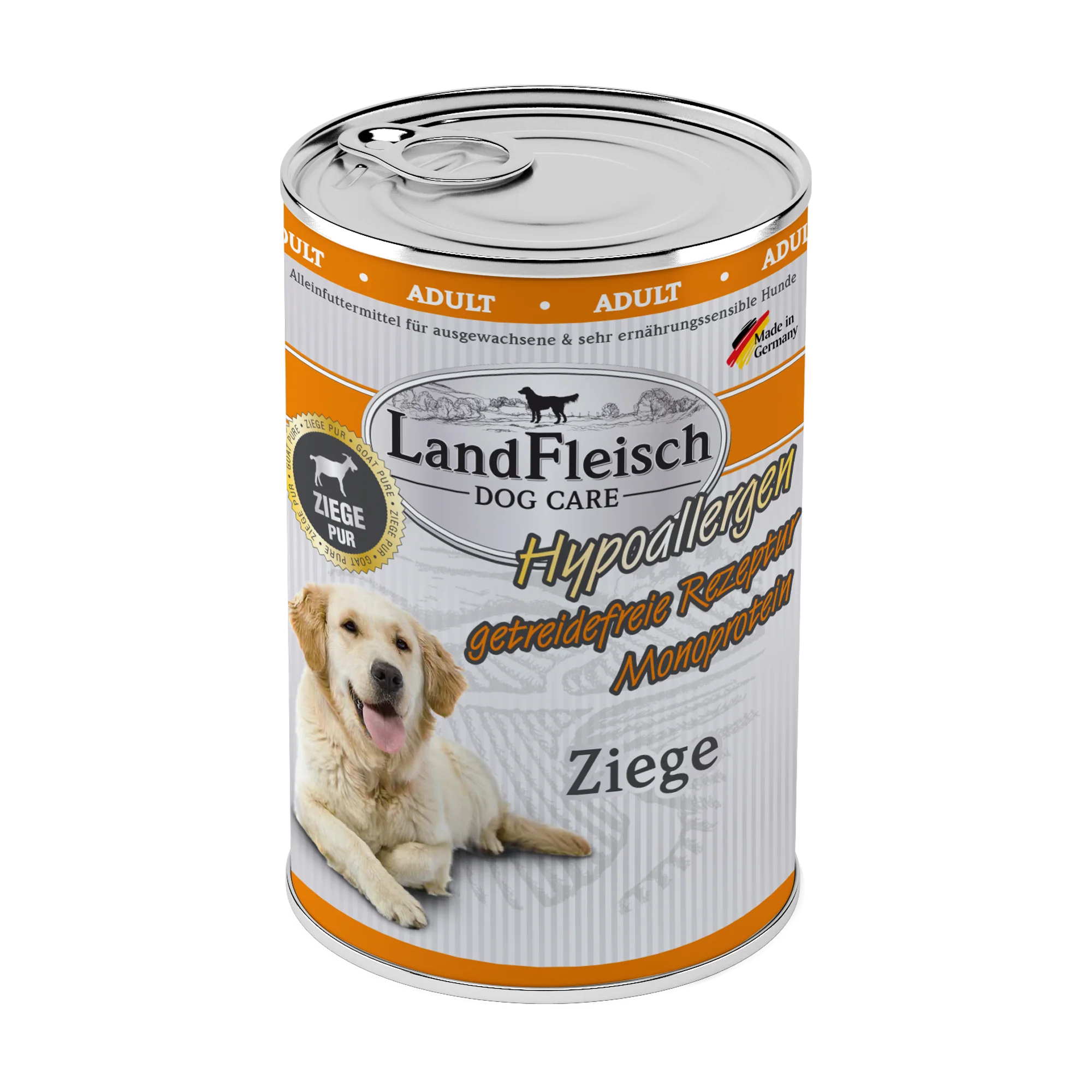 LandFleisch Dog Hypoallergen Ziege - hypoallergen und frei von Getreide, Gluten und Kartoffeln und mit 68 % Ziege. Enthält ausschließlich Fleisch von lebensmittelkontrollierten Schlachttieren und frisches Gemüse. Ist angereichert mit wertvollem Rapsöl und liefert auf diese Weise essenzielle Omega-3- und Omega-6-Fettsäuren für ein glänzendes Fell und eine gesunde Haut. Inulin unterstützt die Darmflora und fördert die Verdauung. Enthält keine künstlichen Geschmacks-, Farb- und Konservierungsstoffe. Alleinfuttermittel für Hunde mit Futtermittelunverträglichkeiten oder sehr sensibler Verdauung.