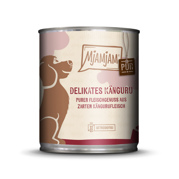 MjAMjAM Dog Känguru pur - mit einem hohen Fleischanteil von 71% bestehend aus Kängurufleisch, -herz, -leber, -lunge, -niere. Ohne künstliche Konservierungs- oder Geschmacksstoffe, getreidefrei und glutenfrei, sowie frei von Zucker und Laktose. Ohne jegliche Tiermehle. Alleinfutter für ausgewachsene Hunde.