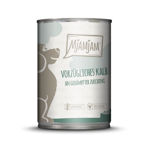 MjAMjAM Dog mit Kalb und Zucchini - mit einem hohen Fleischanteil von 65% bestehend aus Kalbfleisch, -lunge, -herz, -niere, -milz. Ohne künstliche Konservierungs- oder Geschmacksstoffe, getreidefrei und glutenfrei, sowie frei von Zucker und Laktose. Ohne jegliche Tiermehle, Alleinfutter für ausgewachsene Hunde.