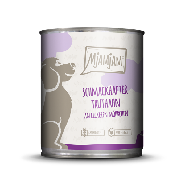 MjAMjAM Dog mit Truthahn und Möhrchen - mit einem hohen Fleischanteil von 65% bestehend aus Kalbfleisch, -lunge, -herz, -niere, -milz. Ohne künstliche Konservierungs- oder Geschmacksstoffe, getreidefrei und glutenfrei, sowie frei von Zucker und Laktose. Ohne jegliche Tiermehle, Alleinfutter für ausgewachsene Hunde.