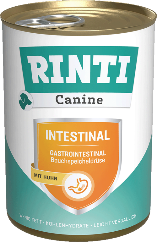 Rinti Canine Intestinal mit Huhn - mit wenig Fett und leicht verdaulich. Wurde für Hunde mit gastrointestinalen Problemen (Bauchspeicheldrüse) entwickelt. Hat einen niedrigen Fettgehalt. Leichtverdauliches Futtermittel mit erhöhtem Natrium- und Kaliumgehalt. Diät-Alleinfuttermittel für ausgewachsene Hunde.