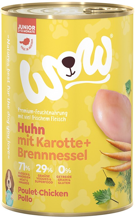 WOW Dog Junior Huhn - mit Karotten und Brennnessel, ist glutenfrei. Enthält 23 % Hühnerfleisch. Mit 71 % Fleischanteil (23 % vom Huhn, 48 % vom Rind). Mit frischem Gemüse, hochwertigen Kräutern und Mineralstoffen. Ohne Soja, Gluten, Zuckerzusatz, Schlachtabfälle, Knochen- und Fleischmehl, Farb-, Aroma- und Konservierungsstoffe, Geschmacksverstärker, sowie ohne Gentechnik. Wurde ohne Tierversuche hergestellt. Alleinfuttermittel für Welpen und junge Hunde im Wachstum von 2 bis 12 Monaten.
