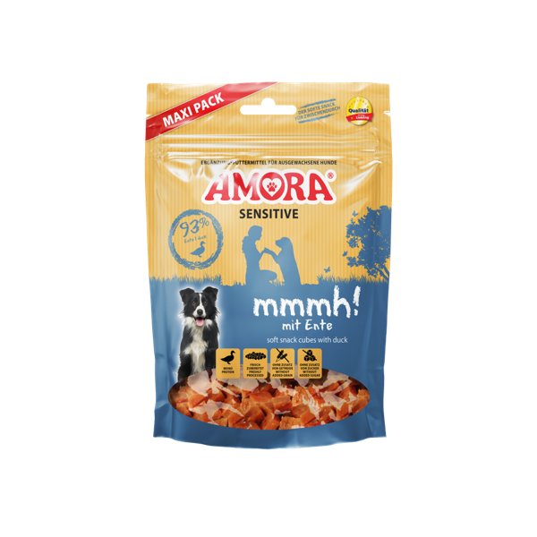 Amora Dog Snack Sensitive mmmh! mit Ente - besteht zu 93 % aus frischem Entenfleisch und enthält wenig Fett. Ohne Zucker, Soja, Mais, Weizen, Farbstoffe, Konservierungsstoffe und Fleischmehle. Mit einer weichen Textur, die auch für Welpen und Senioren geeignet ist. Ergänzungsfuttermittel für Hunde.