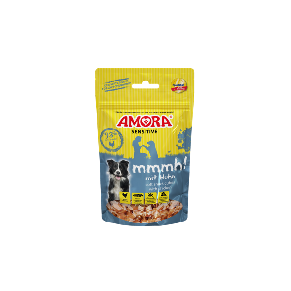 Amora Dog Snack Sensitive mmmh! mit Huhn - besteht zu 93 % aus frischem Hühnerfleisch und enthält wenig Fett. Ohne Zucker, Soja, Mais, Weizen, Farbstoffe, Konservierungsstoffe und Fleischmehle. Mit einer weichen Textur, die auch für Welpen und Senioren geeignet ist. Ergänzungsfuttermittel für Hunde.