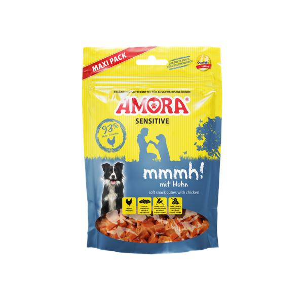 Amora Dog Snack Sensitive mmmh! mit Huhn - besteht zu 93 % aus frischem Hühnerfleisch und enthält wenig Fett. Ohne Zucker, Soja, Mais, Weizen, Farbstoffe, Konservierungsstoffe und Fleischmehle. Mit einer weichen Textur, die auch für Welpen und Senioren geeignet ist. Ergänzungsfuttermittel für Hunde.