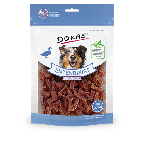 Dokas Dog Entenbrust in Stückchen - mit 93,0% Entenbrustfilet in Stückchen für Training und Motivation. Ergänzungsfuttermittel für Hunde.
