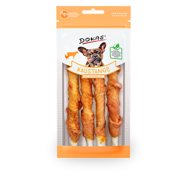 Dokas Dog Kaustange mit Hühnerbrustfilet - mit 55% Rinderhaut und 42% Hühnerbrustfilet. Kaustange aus Rinderhaut mit Hühnerbrustfilet umwickelt. Ergänzungsfuttermittel für Hunde.