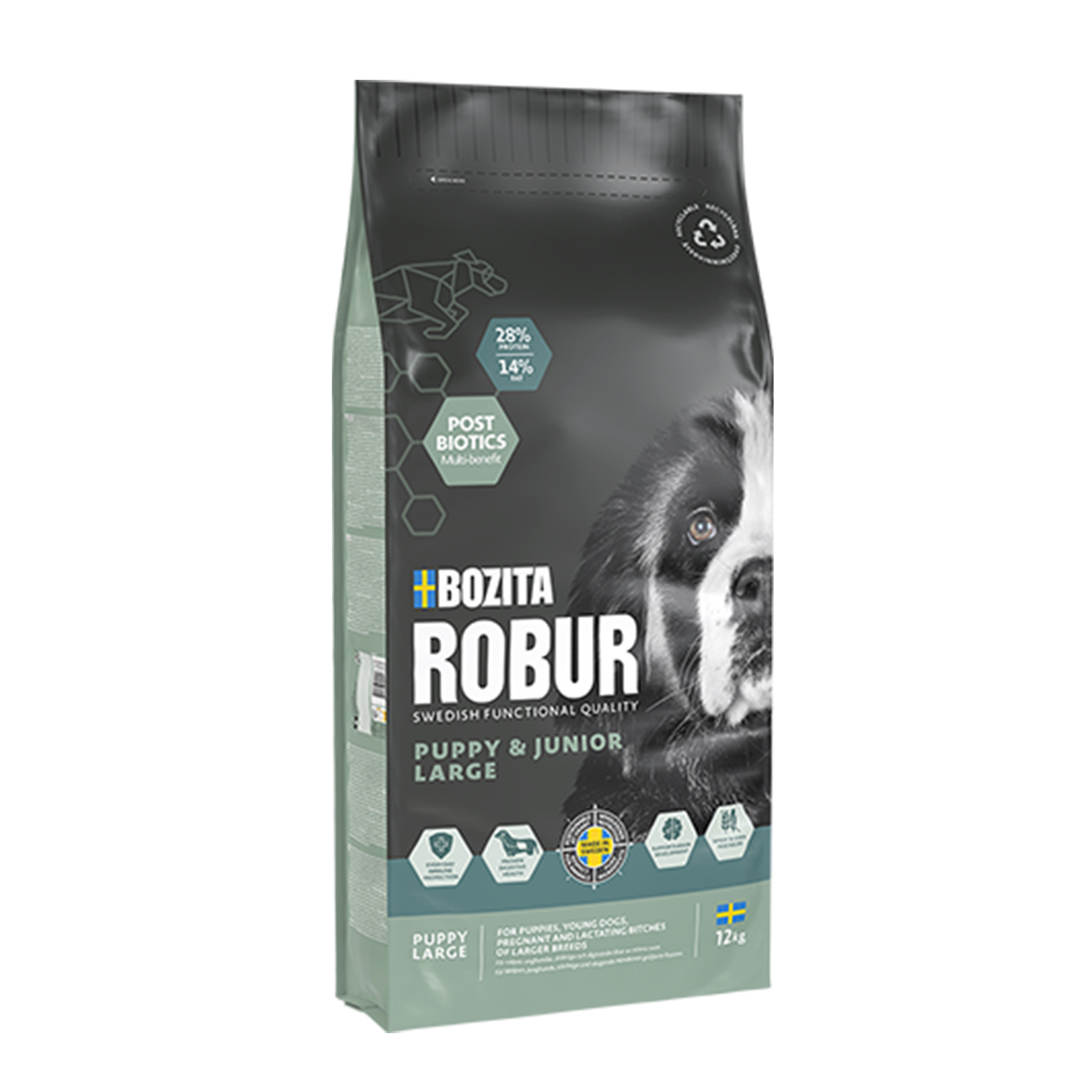 Bozita Dog Robur Puppy & Junior Large - weizenfrei und mit 32% Huhn. Enthält Omega-3-Fettsäuren, die für die Entwicklung der Nervenfunktion des Welpen wichtig sind und zu einem gesunden Herz und einer gesunden Haut beitragen, sowie Glucosamin und Chondroitinsulfat als natürliche Bausteine für gesunde Gelenke. Alleinfuttermittel für Welpen, junge Hunde, trächtige und säugende Hündinnen größerer Rassen.