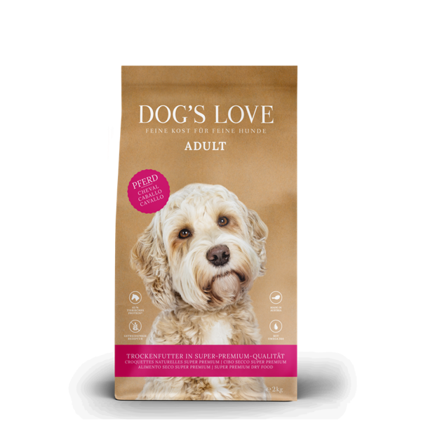 DOGS LOVE Pferd - enthält 38 % frisches Pferdefleisch 12 % Süßkartoffeln. Ist getreidefrei, sowie ohne Soja, Zuckerzusatz, Geschmacksverstärker, Knochenmehl, Schlachtabfälle, als auch künstliche Farb-, Aroma- und Konservierungsstoffe. Ohne Gentechnik und Tierversuche hergestellt. Alleinfuttermittel für ausgewachsene Hunde, da Single Protein und hypoallergen auch für ernährungssensible Hunde geeignet.