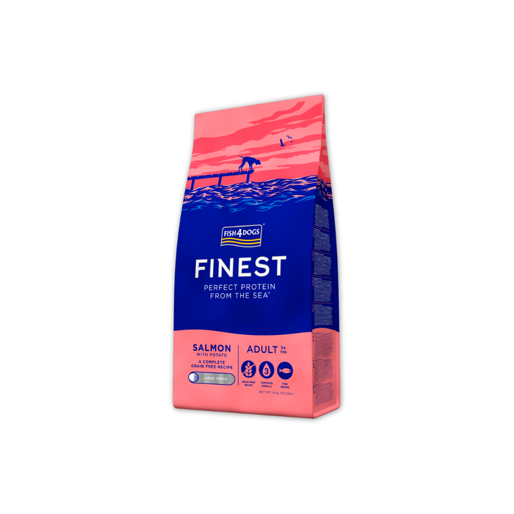 Fish4Dogs Finest Adult Lachs mit Kartoffel - getreidefrei, mit norwegischem Lachs (27 %) und ohne Rind-, Hühner-, Schweine- oder Lammfleisch für Hunde mit Unverträglichkeiten. Enthält natürliches Omega 3 zur Unterstützung der Haut- und Fellgesundheit. Alleinfuttermittel für ausgewachsene Hunde.