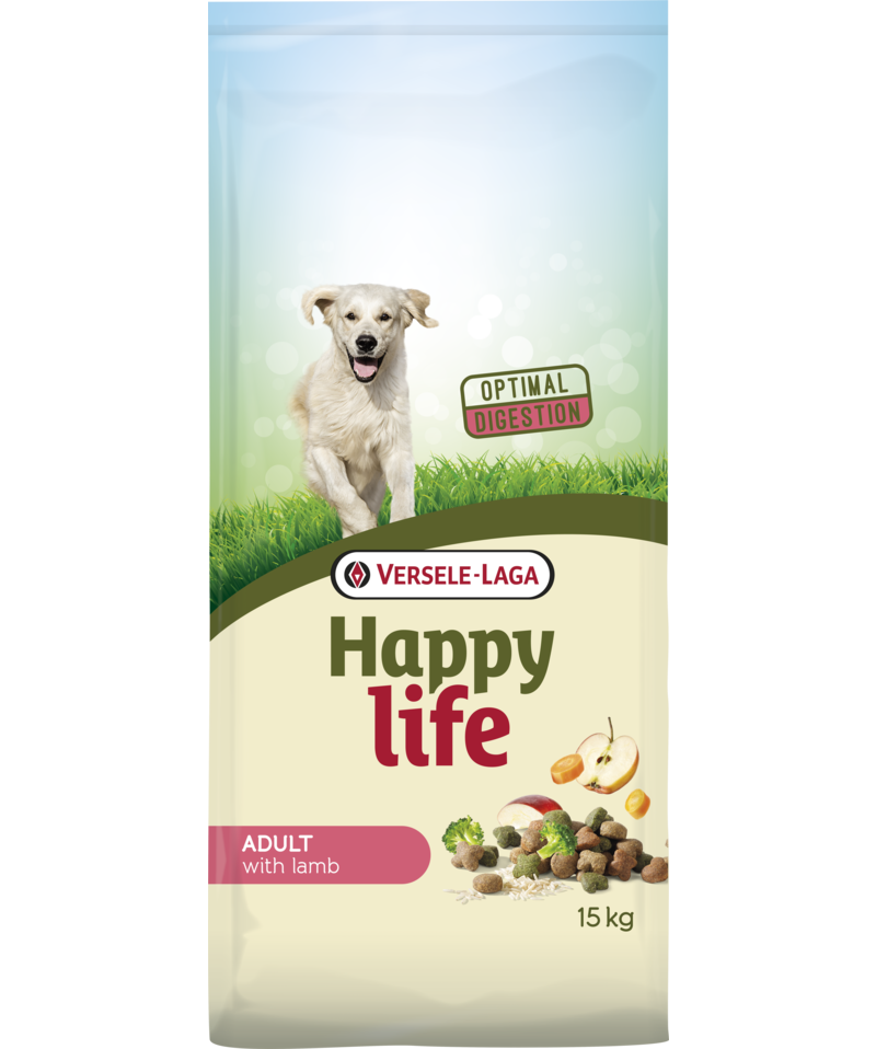 Happy Life Adult mit Lamm - Enthält Lachsöl für gesunde Haut und glänzendes Fell (Omega-3-Fettsäuren), sowie Apfel für eine gesunde Darmflora (Pektine). Ist leicht verdauliche Nahrung auf der Basis von Lamm und Reis. Alleinfuttermittel für ausgewachsene Hunde.