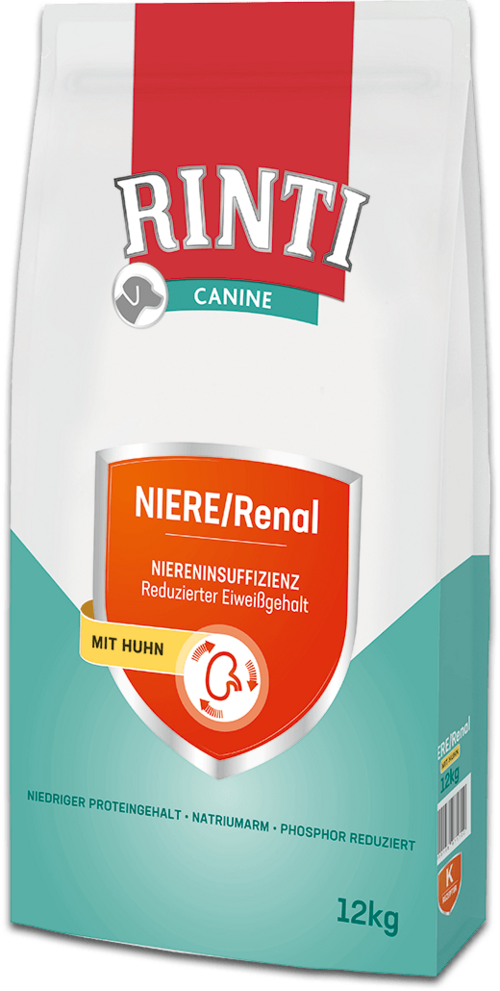 Rinti Canine Niere & Renal mit Huhn - speziell entwickelt zur Unterstützung der Nierenfunktion bei chronischer oder akuter Niereninsuffizienz. Mit reduziertem und hochwertigem Eiweiß in einer leicht verdaulichen Zusammensetzung. Mit reduziertem Proteingehalt und reduziertem Natrium- und Phosphorgehalt. Diät-Alleinfuttermittel für ausgewachsene Hunde.
