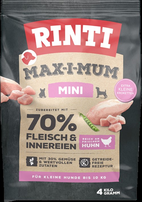 Rinti Max-i-Mum Mini Huhn - ist getreidefrei und reich an frischem Huhn, mit 65% frischem Fleisch und frischen Innereien und 30% Gemüse. Mit einem erhöhten Fettgehalt, sowie einem ausgewogenen Protein-/Fett-Verhältnis für eine schonende Verdauung. Mit einem hohen Frischfleischgehalt (90% frisches Fleisch im Fleischanteil), sowie mit Gemüse angereichert. Das Futter beinhaltet ein ausgewogenes Protein-/Fett-Verhältnis für eine schonende Verdauung. Alleinfutter für ausgewachsene Hunde kleiner Rassen.