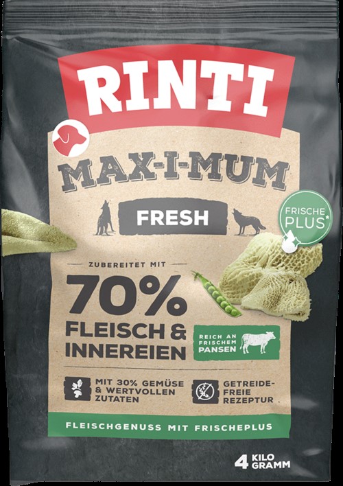 Rinti Max-i-Mum Pansen - ist getreidefrei und reich an frischem Pansen, mit 65% frischem Fleisch und frischen Innereien und 30% Gemüse. Durch den erhöhten Fettgehalt ist ein ausgewogenes Protein-/Fett-Verhältnis für eine schonende Verdauung gewährleistet. Mit einem hohen Frischfleischgehalt (90% frisches Fleisch im Fleischanteil), sowie mit Gemüse angereichert. Das Futter beinhaltet ein ausgewogenes Protein-/Fett-Verhältnis für eine schonende Verdauung. Alleinfuttermittel für normal aktive, ausgewachsene Hunde.