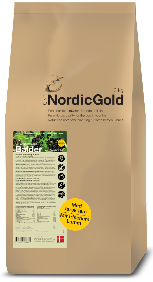 Uniq Nordic Gold Balder - enthält Krill, Schalentiere und Fischöl aus der Nordsee und Obst und Gemüse aus dänischem Anbau, sowie Bio-Kräuter aus eigenem Anbau. Ist getreidefrei und Singleprotein. Ohne künstliche Zusatzstoffe und Geschmacksverstärker. Alleinfutter für erwachsene Hunde, sowie Hunde mit Allergie- und Fellproblemen.