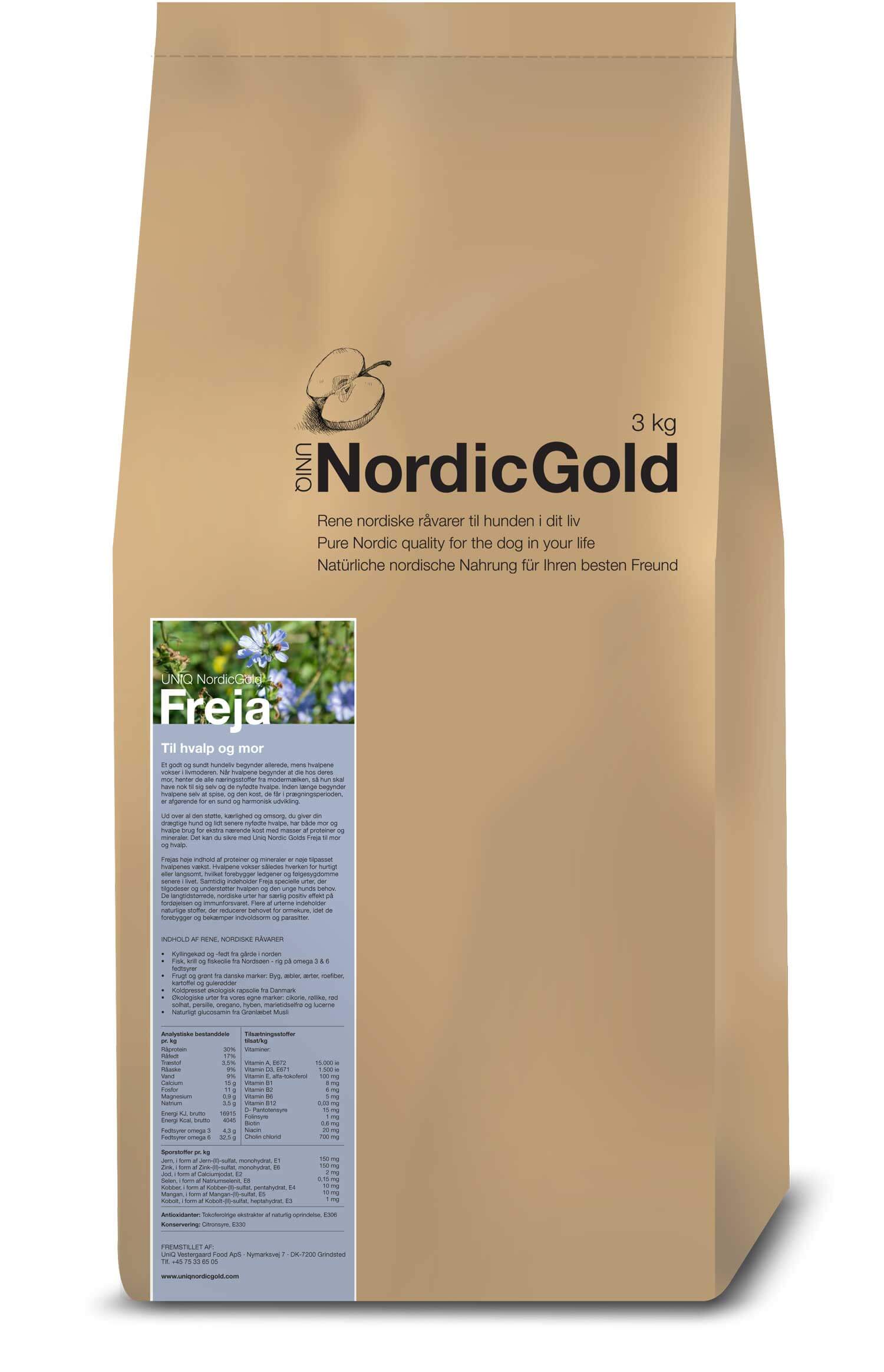 UniQ Nordic Gold Freja - getreidefrei und glutenfrei, enthält Fisch und Krill aus der Nordsee und Obst und Gemüse aus dänischem Anbau, sowie kaltgepresstes Bio Rapsöl aus Dänemark. Mit natürlichen und gesunden Mineralstoffen, Vitaminen und Nährstoffen und ohne künstliche Zusatzstoffe und Geschmacksverstärker. Der hohe Eiweiß- und Mineralstoffanteil von Freja ist genau auf das Wachstum der Welpen abgestimmt. Alleinfutter für Mutter und Welpen.