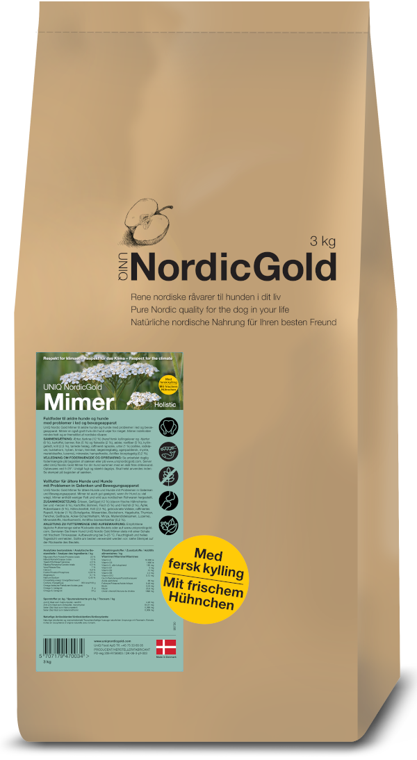 UniQ Nordic Gold Mimer - getreidefrei und glutenfrei, enthält Fisch, Krill und Schalentiere aus der Nordsee und Obst und Gemüse aus dänischem Anbau, sowie kaltgepresstes Bio-Raps- und Hanfsamenöl aus Dänemark. Mit natürlichen und gesunden Mineralstoffen, Vitaminen und Nährstoffen und ohne künstliche Zusatzstoffe und Geschmacksverstärker. Alleinfutter für ältere Hunde und Hunde mit Problemen in Gelenken und Bewegungsapparat, sowie als Diätkost für übergewichtige Hunde geeignet.