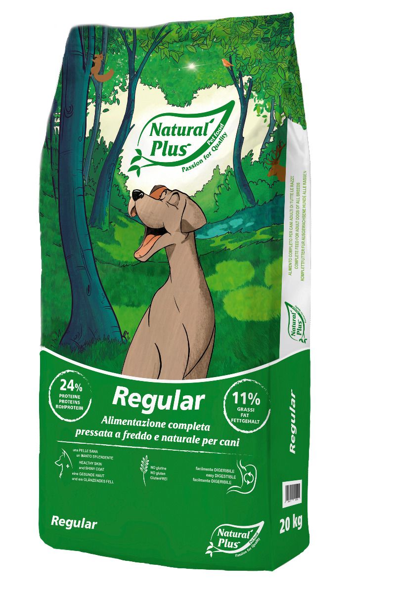 REGULAR ist glutenfrei und ohne Weizen. Geeignet für normal aktive Hunde aller Rassen, aus unserer speziell für Züchter und Jäger entwickelten NATURAL PLUS LINIE. Durch die schonende Herstellung im Kaltpressverfahren bleiben natürliche Vitamine und Wirkstoffe erhalten und sorgen zusammen mit hochaufgeschlossenen pflanzlichen Proteinen und 30% getrocknetem Fleisch für eine sehr gute Verdaulichkeit - auch bei ernährungssensiblen Hunden. Leinsamen unterstützt eine gute Verdauung und Lachsöl sorgt für eine gesunde Haut und ein glänzendes Fell.