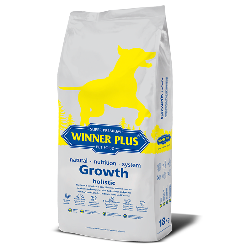 Winner Plus Growth Holistic - glutenfrei. Hergestellt ohne klassische Cerealien, Soja, Eier, künstliche Farbstoffe oder Aromen und ohne Gluten. Ohne Tierversuche hergestellt. Alleinfuttermittel für nahrungssensible Welpen mit erhöhtem Nährstoffbedarf in allen Wachstumsphasen, auch für junge Hunde mit Allergien und Unverträglichkeiten.
