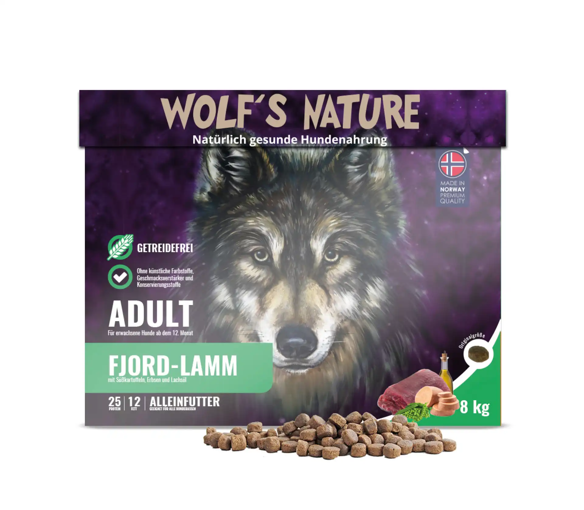 Wolfs Nature Adult Lamm - getreidefrei, mit Lamm 28 % und mit leicht verdaulichen Süßkartoffeln und Lachsöl, sowie Omega-3 & -6 Fettsäuren für Haut für Fell. Frei von künstlichen Zusatzstoffen, Hormonen und Antibiotika. Hergestellt nach dem norwegischen Lebensmittelgesetz. Alleinfuttermittel für ausgewachsene Hunde.