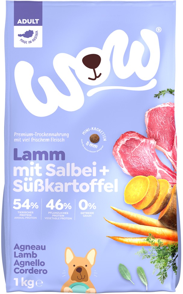 WOW Dog Minis Adult Lamm - mit Spinat und Cranberries, enthält 46% Lamm und 8% Süßkartoffeln. Ohne Getreide, künstliche Farb-, Aroma- und Konservierungsstoffe, sowie ohne Zuckerzusatz. Wurde ohne Tierversuche.hergestellt. Mit einem hohen Frischfleischanteil von 28 %, sowie mit frischem Gemüse, hochwertigen Kräutern und Mineralstoffen. Krokettengröße (8 mm) auch für kleinere Hunde geeignet. Alleinfuttermittel für kleinere, ausgewachsene Hunde aller und Rassen.