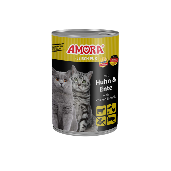 AMORA Cat Fleisch Pur Adult mit Huhn & Ente - mit 10 % Huhn, 10 % Ente. Enthält besonders viel tierisches Eiweiß, Vitamine und Mineralstoffe. Hergestellt in Deutschland ohne Aroma-, Farb- oder Konservierungsstoffe, ohne Schweinefleisch und sowie ohne Zucker. Alleinfuttermittel für ausgewachsene Katzen.