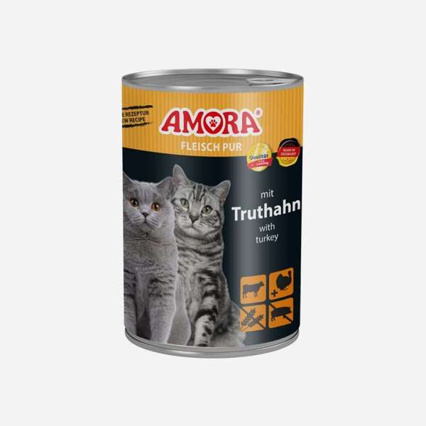 AMORA Cat Fleisch Pur Adult mit Truthahn - mit 20 % Truthahn. Enthält besonders viel tierisches Eiweiß, Vitamine und Mineralstoffe. Hergestellt in Deutschland ohne Aroma-, Farb- oder Konservierungsstoffe, ohne Schweinefleisch und sowie ohne Zucker. Alleinfuttermittel für ausgewachsene Katzen.