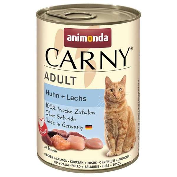 Animonda Cat Carny Adult Huhn & Lachs - enthält 60 % Huhn. Mit natürlichem Taurin und ohne Soja, Getreide und Zucker. Eine natürliche Quelle für Calcium, Natrium und Chlorid. Versorgt ausgewachsene Katzen mit allen lebenswichtigen Nährstoffen. Alleinfuttermittel für ausgewachsene Katzen von 1 bis 6 Jahren.