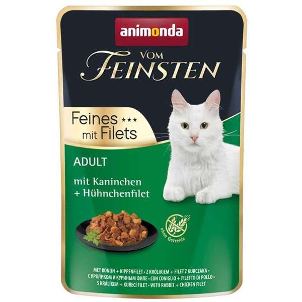Animonda Cat Vom Feinsten Adult Feines mit Filets Kaninchen & Hühnchenfilet - enthält 4 % Kaninchen, ist ohne Getreide, ohne Zucker, sowie ohne Farb- und Konservierungsstoffe und Soja. Zarte Stückchen mit Filets in delikater Sauce. Alleinfuttermittel für ausgewachsene Katzen.