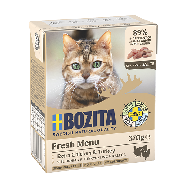 Bozita Häppchen in Sauce mit viel Huhn & Pute - getreidefrei, zuckerfrei sowie fettarm. Ohne künstliche Farb-, Geschmacks- und Konservierungsstoffe. Mit einem hohen Fleisch- und einen niedrigen Fettgehalt für einen natürlich ausgewogenen Vitamin- und Mineraliengehalt. Zutaten aus der nordischen Natur und von ausgewählten schwedischen Bauernhöfen. Alleinfuttermittel für ausgewachsene Katzen aller Lebensphasen.