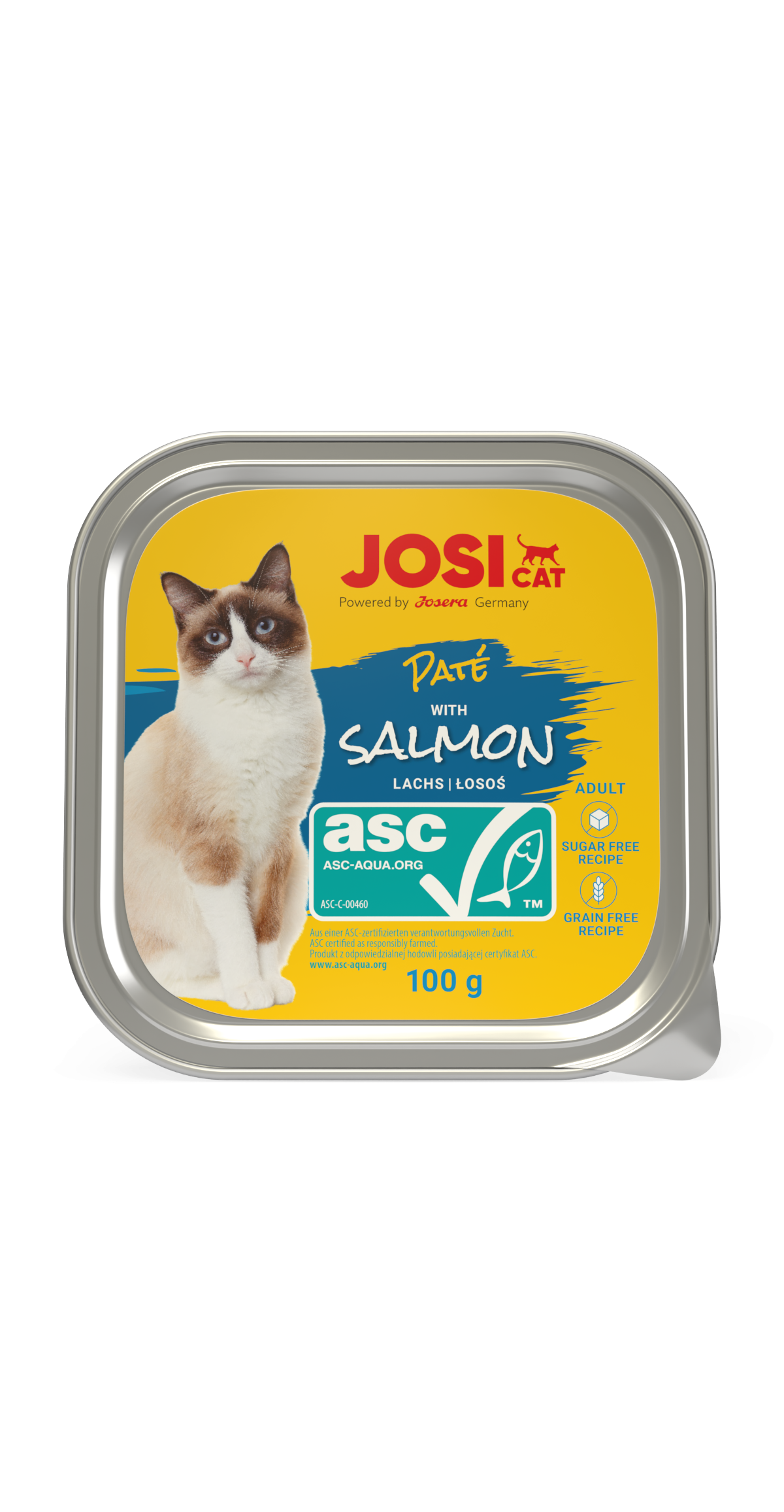 JosiCat Pate Salmon - mit Vitaminen wie Vitamin E und D3 für Zellschutz und Knochenbau, sowie Biotin, Kupfer und Zink für ein glänzendes Fell . Hergestellt ohne Gentechnik und ohne Tierversuche in Deutschland. Ohne Farb- und Aromastoffen und Konservierungsmittel. Alleinfuttermittel für ausgewachsene Katzen.