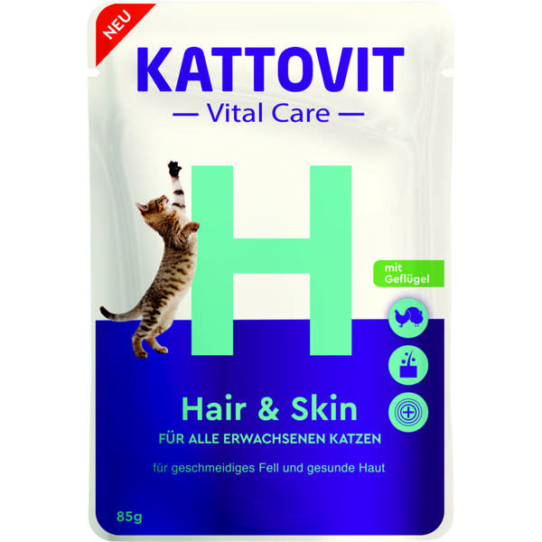 Kattovit Feline Vital Care Hair & Skin - Ausgewählte, hochwertige Proteinquellen können sich positiv auf die Bildung einer gesunden Haut und eines glänzenden Fells auswirken. Wurde mit Ernährungsexperten entwickelt, durch die Anreicherung mit Taurin und Vitamin A, kann das Immunsystem durch diese spezielle Wirkstoffformel gestärkt werden. Alleinfuttermittel für ausgewachsene Katzen.