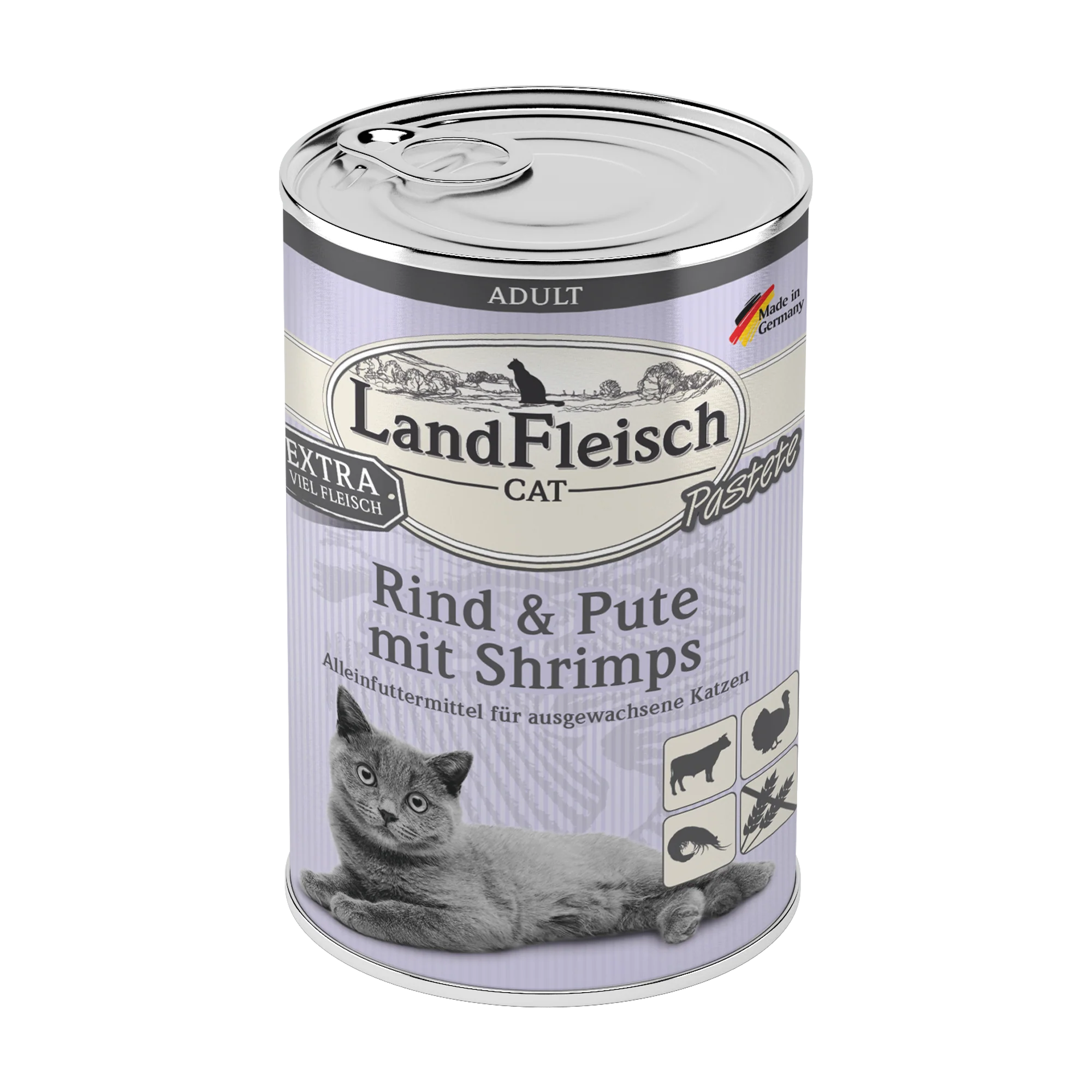 LandFleisch Cat Adult Pastete mit Rind, Pute mit Shrimps - ohne Getreide und Gluten, sowie mit 38% vom Rind aus Fleisch, Lungen, Lebern, Herzen und 26% vom Pute aus Fleisch, Lebern, Herzen, Hälsen. Eine Pastete mit hochwertigen Proteinen von Rind, Pute mit Shrimps. Ohne Zucker, Soja, künstliche Farb-, Geschmacks- und Konservierungsstoffe. Hergestellt im schonenden Produktionsverfahrens der Kaltabfüllung. Alleinfuttermittel für Katzen.