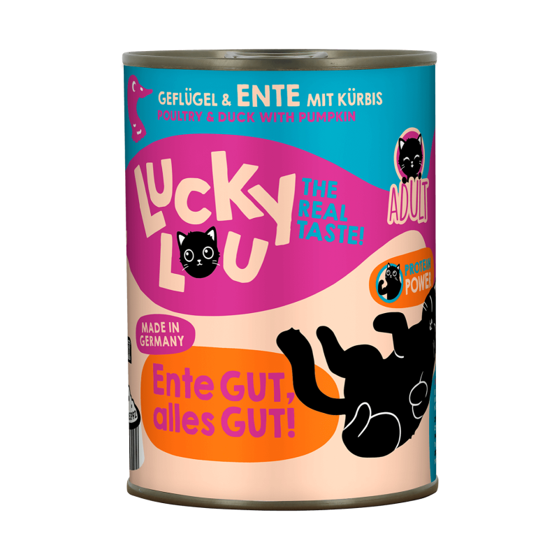 Lucky Lou Adult Geflügel & Ente - glutenfrei und getreidefrei, mit einem Fleischanteil von 60 % Geflügel, bestehend aus Herz, Muskelfleisch, Leber, Magen, Hals und Fett, sowie 10 % Ente. Ist frei von Zuckerzusätzen und Gentechnik, wie auch Konservierungsstoffen. Wird in Deutschland ohne Tierversuche hergestellt. Alleinfutter für ausgewachsene Katzen.