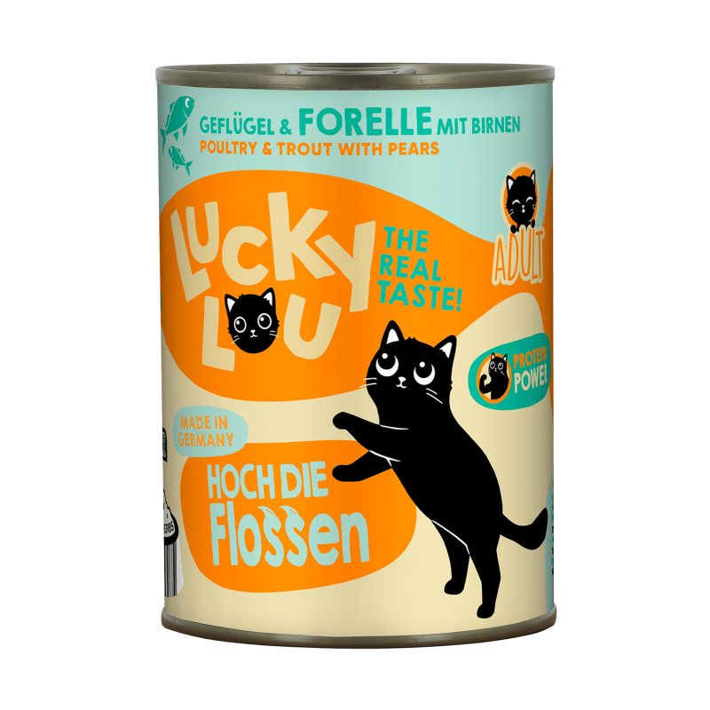 Lucky Lou Adult Geflügel & Forelle - glutenfrei und getreidefrei, mit einem Fleischanteil von 60 % Geflügel, bestehend aus Herz, Muskelfleisch, Leber, Magen, Hals und Fett, sowie 10 % Forelle. Ist frei von Zuckerzusätzen und Gentechnik, wie auch Konservierungsstoffen. Wird in Deutschland ohne Tierversuche hergestellt. Alleinfutter für ausgewachsene Katzen.
